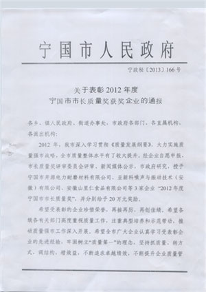 2013年9月27日,寧國市政府通報表彰2012年度寧國市市長質量獎獲獎企業。